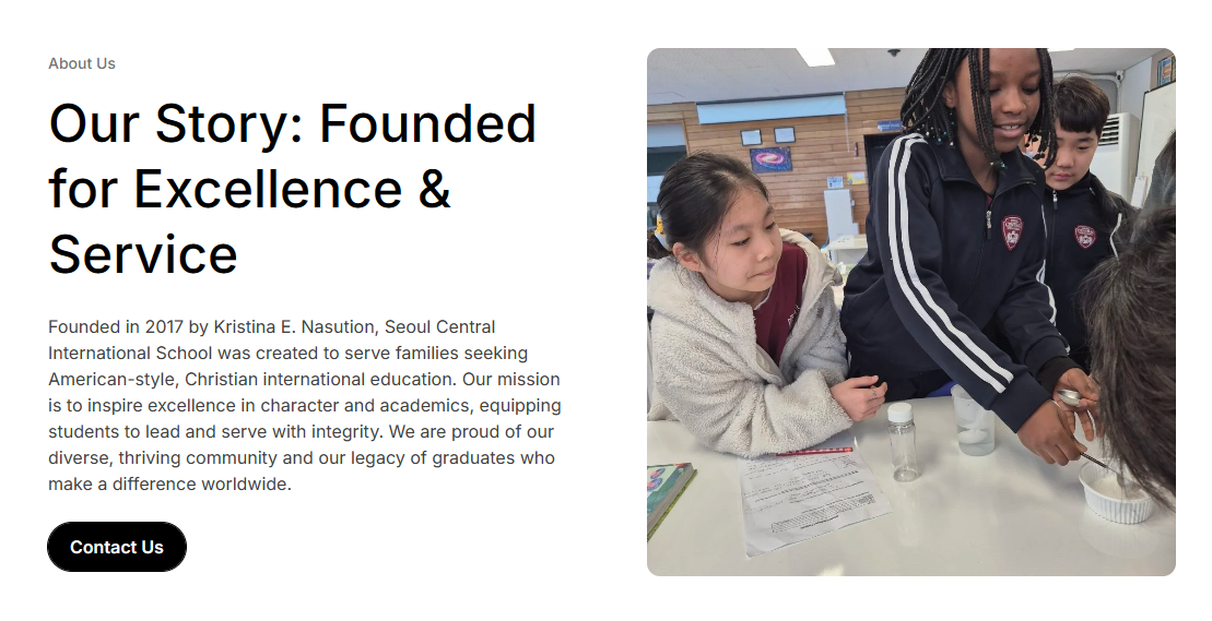 Seoul Central International School was founded in 2017 by Kristina E. Nasution. Created to serve families seeking a Christian, American education. Our mission is to inspire excellence in character and academics, equipping students to lead and serve their future communities with integrity. We are proud of our diverse legacy of graduates, who are making a lasting impact in different places around the world.